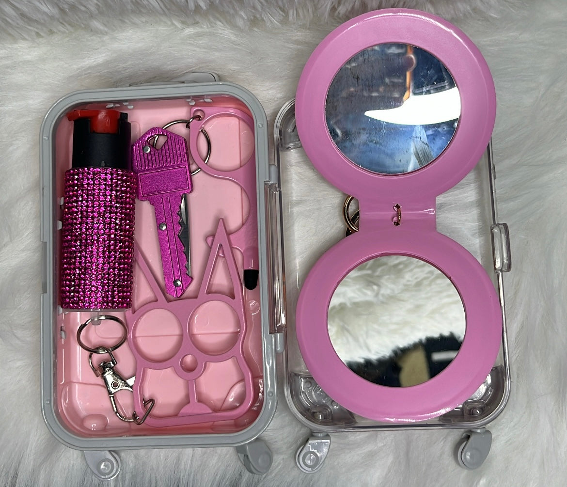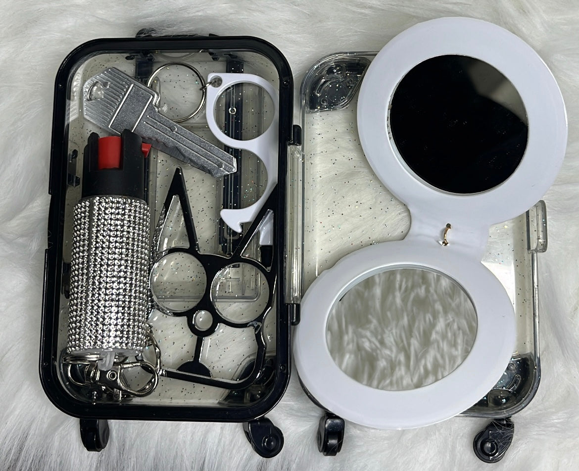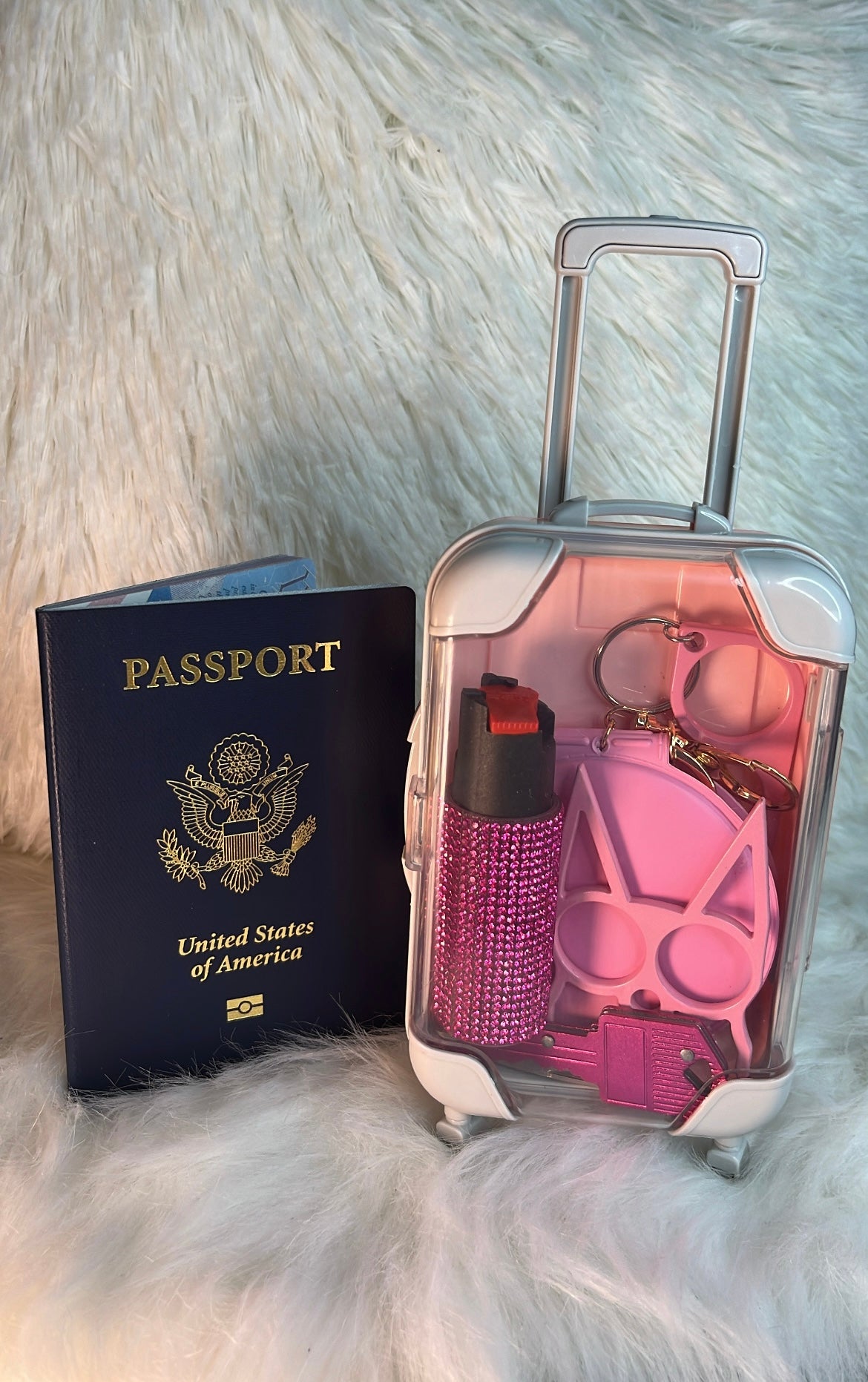 “Passport Junkie” sets include a mini suitcase, pepper spray, foldable mirror, key knife, door opener, and cat knuckle.