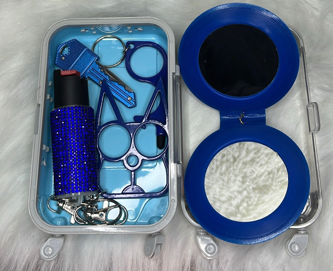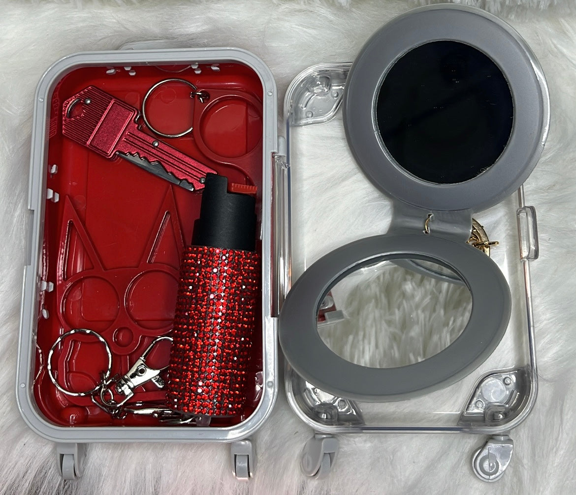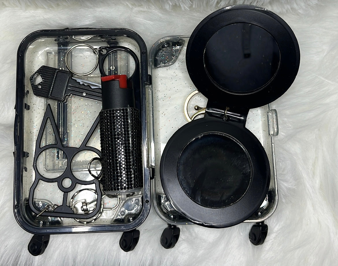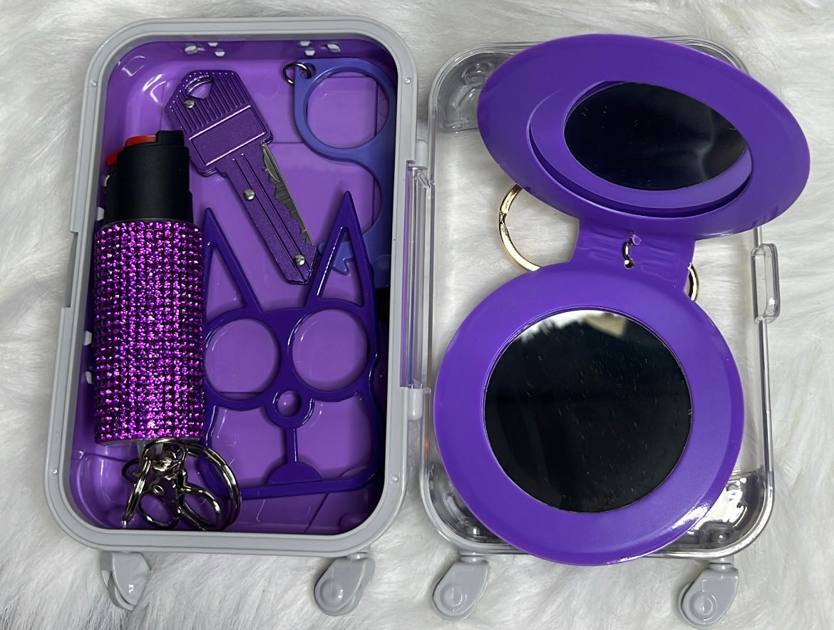 “Passport Junkie” sets include a mini suitcase, pepper spray, foldable mirror, key knife, door opener, and cat knuckle.