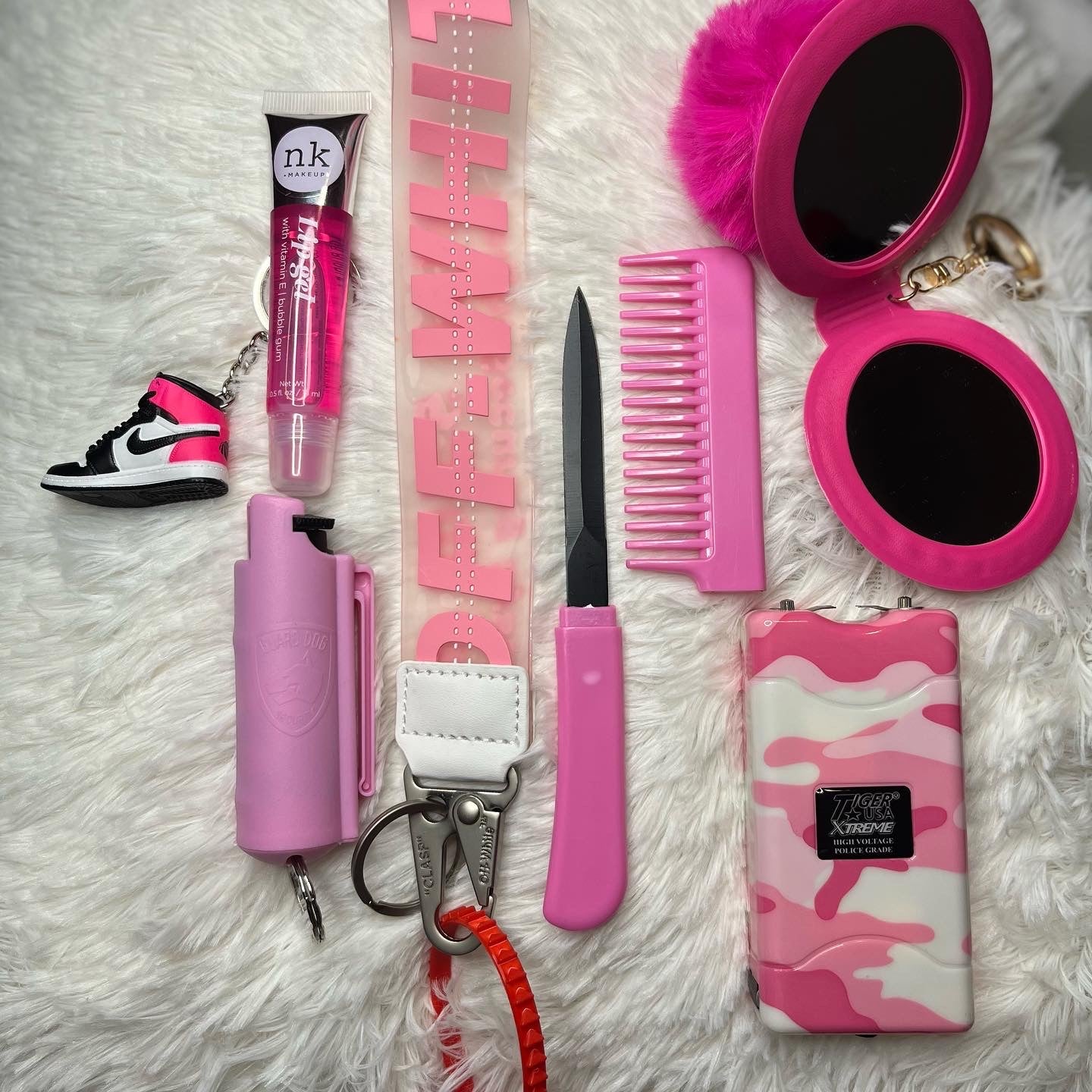 The Pretty Pack is perfect for young ladies in college or high school! All the basics that you should carry around to stay safe and pretty are included HERE! Pretty Packs include a lanyard, pepper spray, stun gun, comb knife, lipgloss, shoe keychain, and a fuzzy ball mirror. Currently available in colors pink, blue, red, and black.