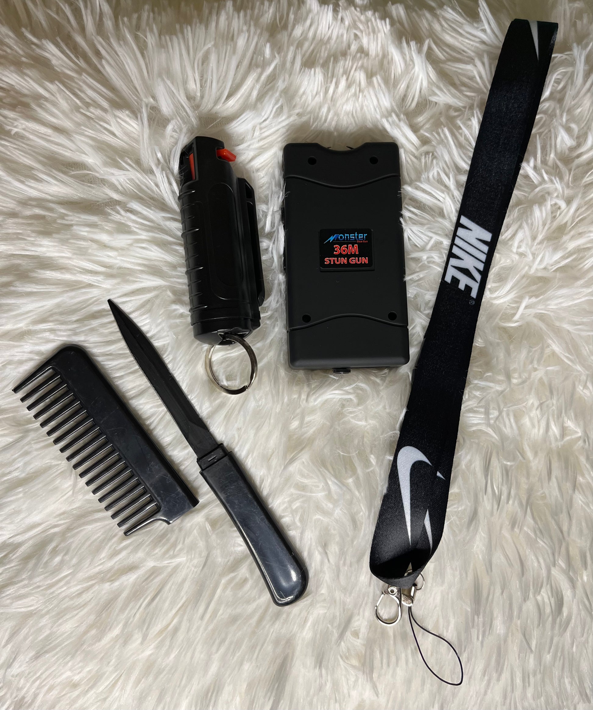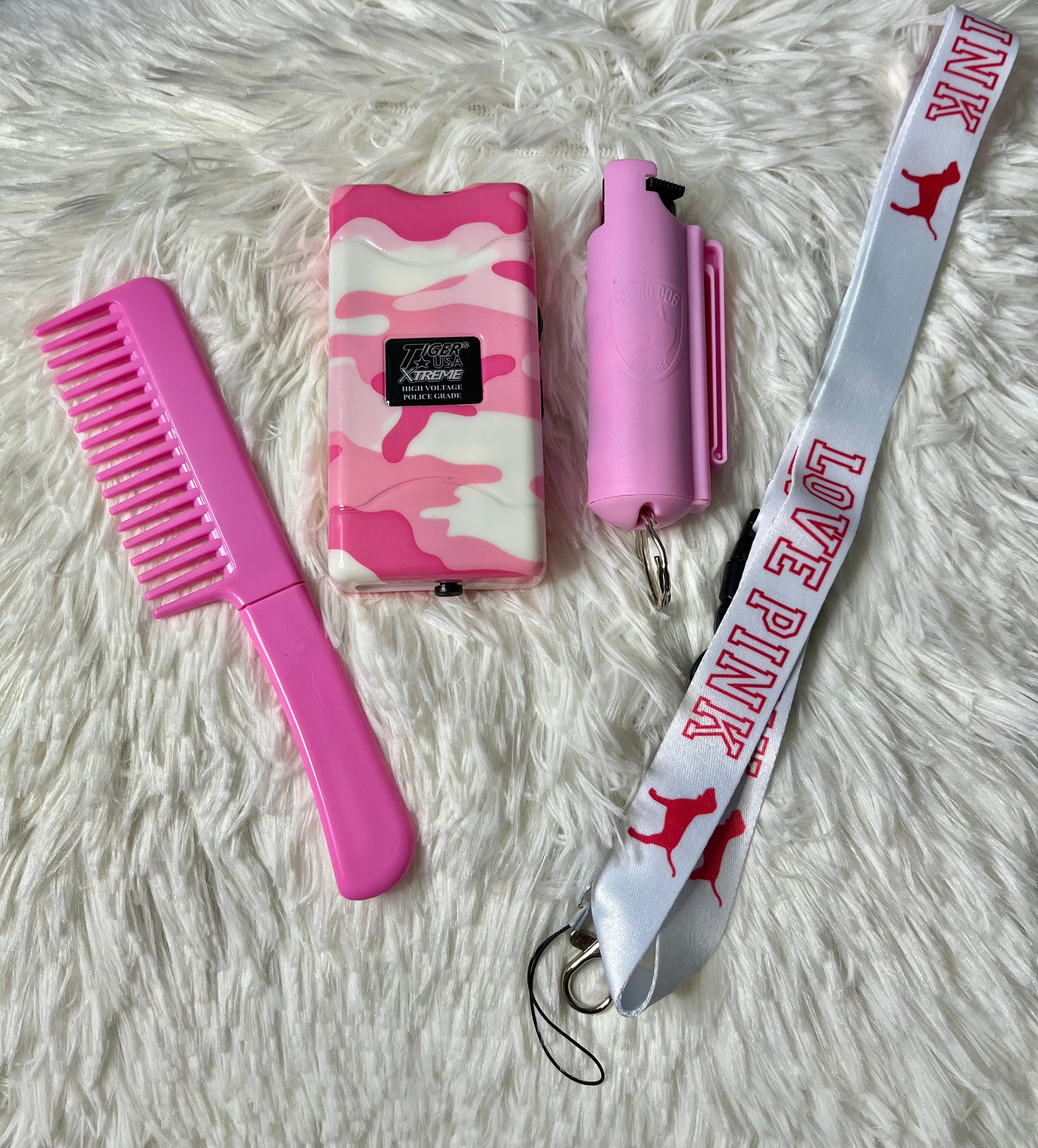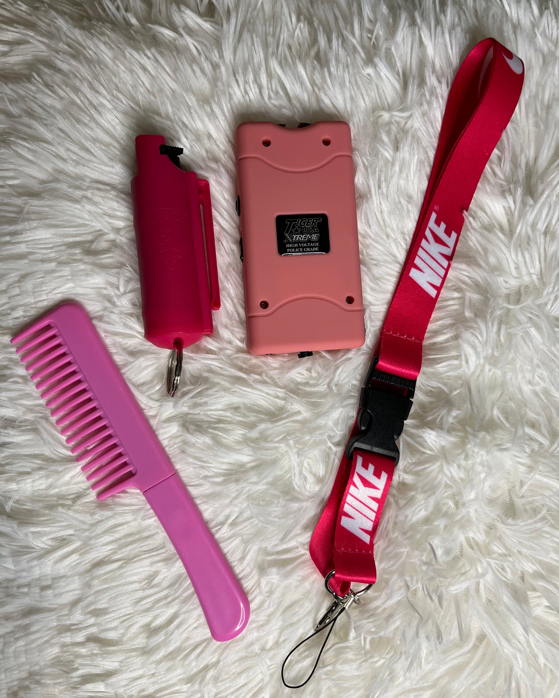 No keychain? No problem! Pretty Protective Gear is gonna get you right with all the essentials that you need! The Starter Kit includes a stun gun, pepper spray, disguisable comb knife, and a lanyard!